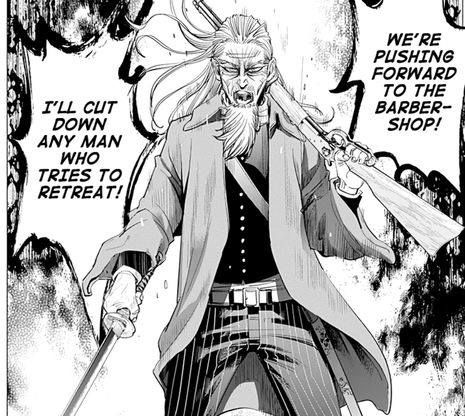 The memory is from high up, in a wooden belltower, Ogata's rifle comfortably in his hands as he crouches in his perch. The hostage is being lead out in exchange for the tattooed skin, but there's something off about her. No. It's a fakeout, Ogata is sure of it. That isn't Hidoro's pregnant mistress at all. He's sure of it. So he lines up a shot, aiming right at that belly. And sure enough, when "she" falls it's only to reveal Nagakura Shinpachi beneath. Ogata chambers a fresh round and chuckles to himself, "I knew it was one of the old guys. Hidoro, the pathetic old bastard, reaches for the tattooed skin, laying forgotten on the ground, and Ogata plugs another shot into his outstretched hand for his trouble. He shouts at Umakichi, his employer, to go and grab the skin already. But then, just as Hidoro's men are about to fall to pieces in confusion, there he is. Hijikata Toshizo stands there, Izuminokami Kanesada in one hand, winchester rifle in the other, telling the men to rally under him or be killed. He's spectacular. Even in his advanced age, Ogata still thinks this is a man who truly lives up to the title of demon vice-commander. And whatever hell he came from, Ogata wants to get closer to it.]